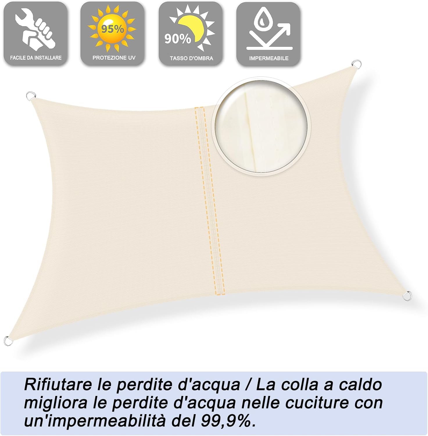 Kvadratno senčno jadro nudi zanesljivo zaščito pred soncem in rahlim dežjem ter elegantno dopolni zunanje prostore. Izdelano je iz goste poliestrske tkanine z vodoodporno PU prevleko, ki učinkovito odbija vodo in blokira več kot 95 % UV-žarkov. Idealno je za uporabo na vrtu, terasi ali ob bazenu.