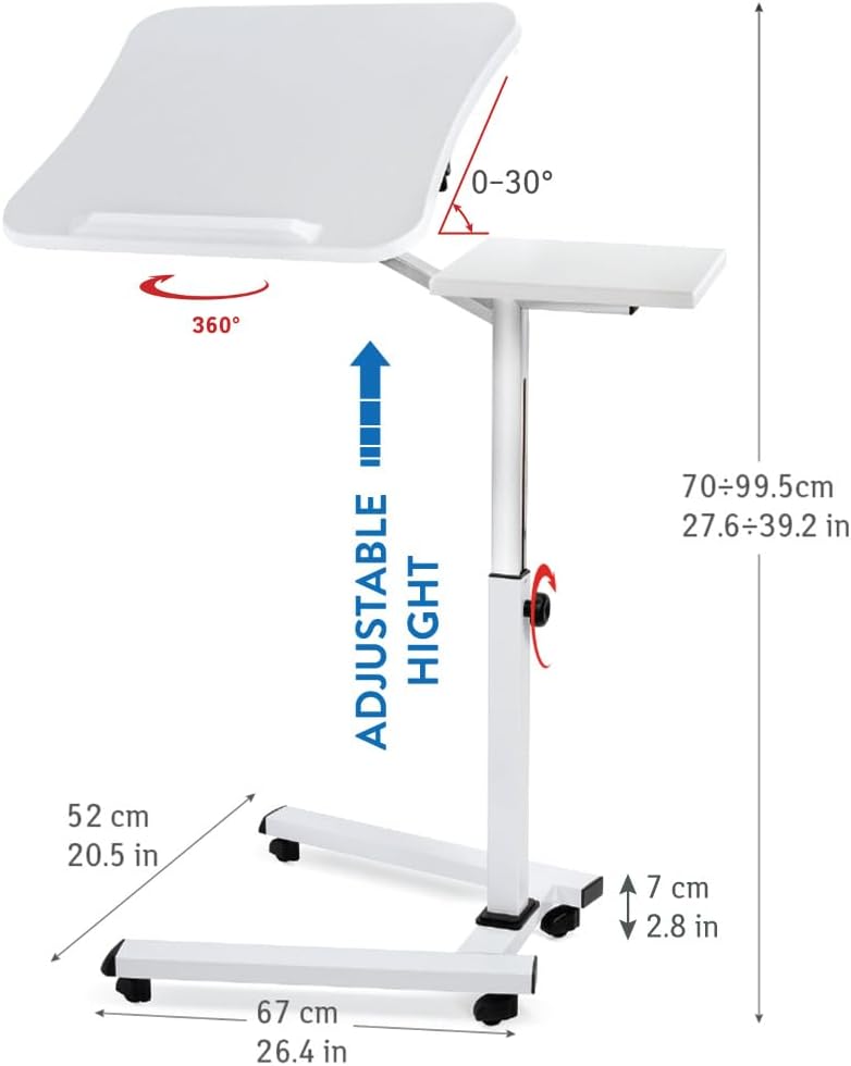 TATKRAFT LIKE je stabilna in ergonomsko zasnovana mizica za prenosnik, izdelana iz kombinacije robustnega jekla in kakovostne MDF lesene plošče v beli barvi. Zasnovana je za prilagodljivo uporabo doma, v spalnici ali dnevni sobi, saj omogoča nastavitev višine, nagiba in smeri plošče. Dodatna površina za miško in kolesa za enostavno premikanje povečujejo funkcionalnost in udobje pri uporabi.