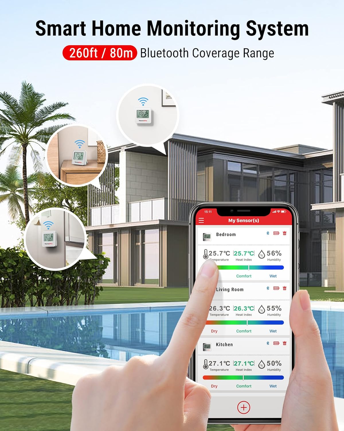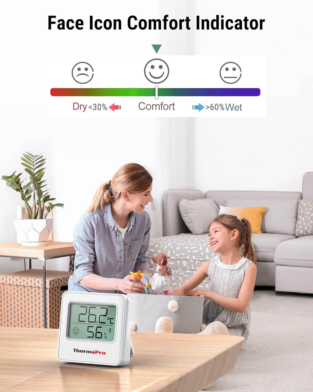 Ta digitalni notranji termometer in higrometer ThermoPro TP357 omogoča natančno spremljanje temperature in vlage v prostoru, vključno z otroškimi sobami, pisarnami, vinskimi kleti ali rastlinjaki. Naprava se poveže preko Bluetootha z razdalje do 80 m, podatki pa se samodejno osvežujejo vsakih 10 sekund.