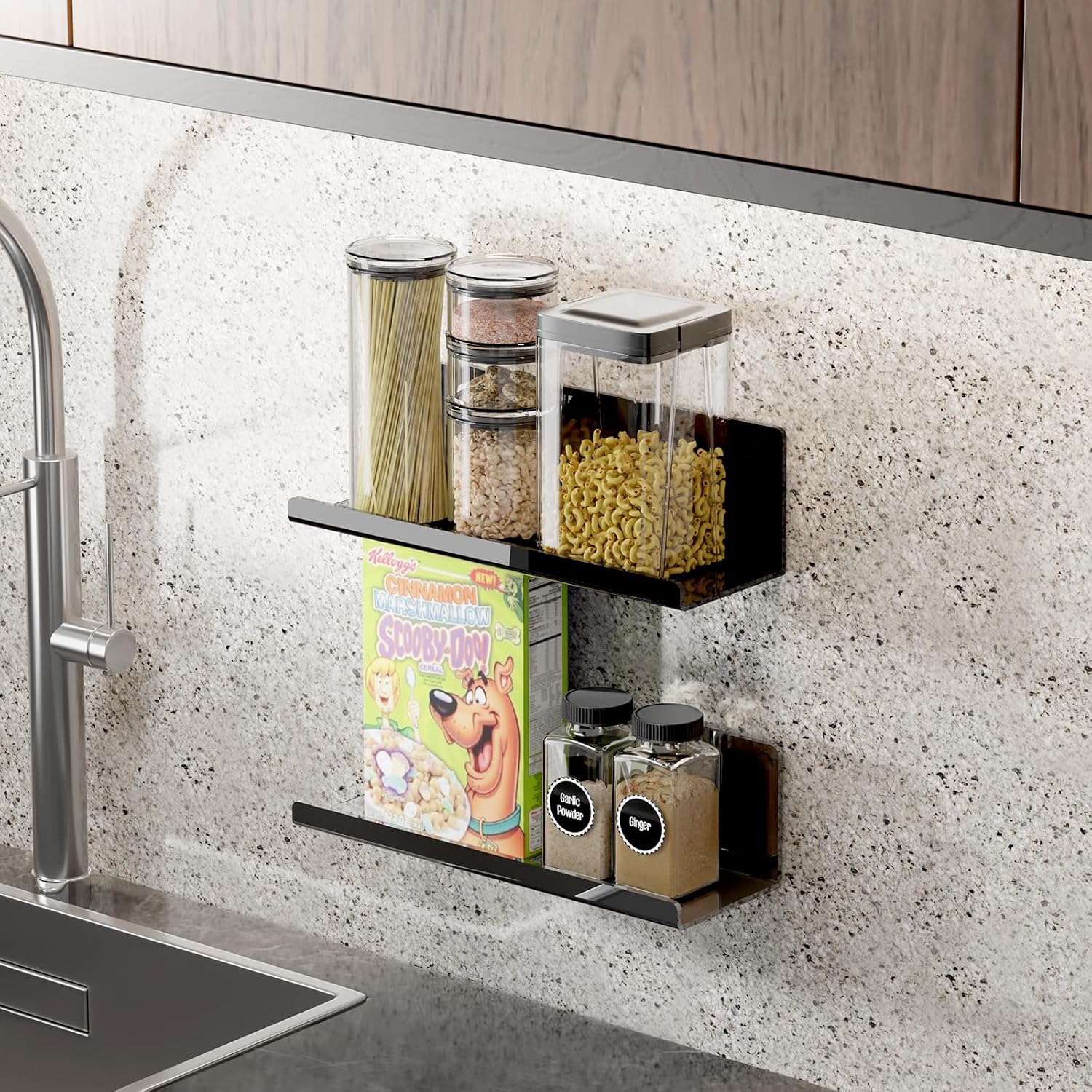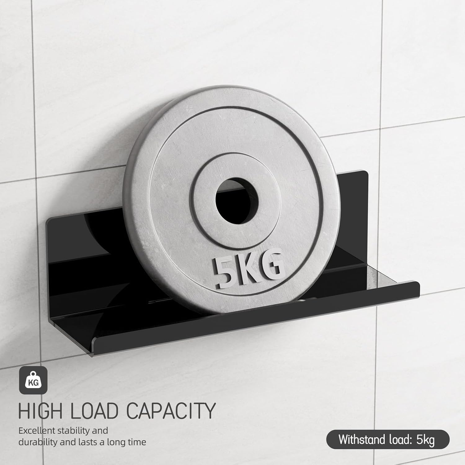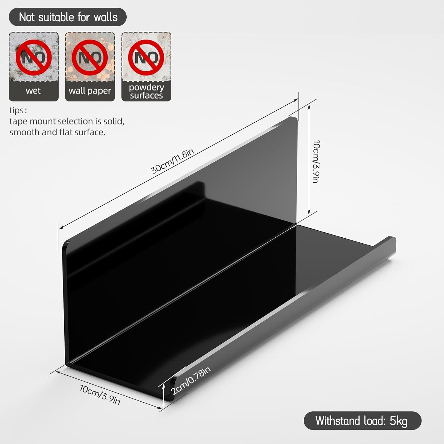 Praktična stenska polica iz visokokakovostnega akrila, ki se pritrdi brez vrtanja in poškodb sten. Sodobna, črna zasnova se odlično prilega kuhinji, kopalnici, pisarni ali dnevni sobi.
