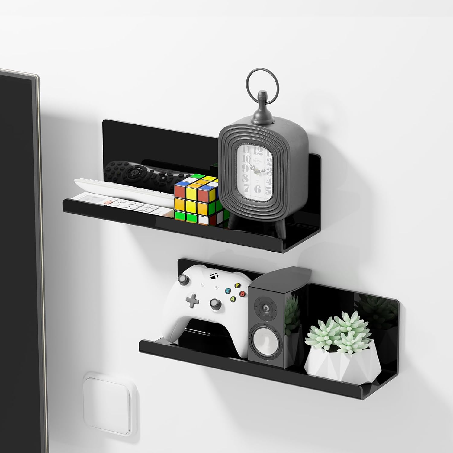 Ta komplet dveh akrilnih polic omogoča hitro in čisto rešitev za dodatni prostor, ne da bi pri tem poškodovali stene.