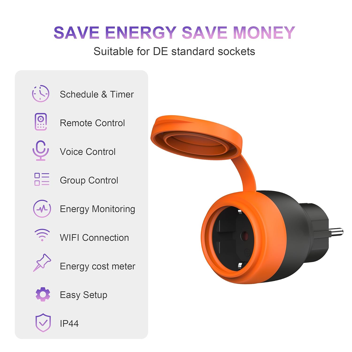 Dvojni komplet pametnih, vodoodpornih zunanjih vtičnic z merilnikom porabe energije, glasovnim upravljanjem in časovnim programiranjem. Uporabniku omogoča popoln nadzor nad porabo in delovanjem električnih naprav – prek aplikacije, urnikov ali glasovnih ukazov.