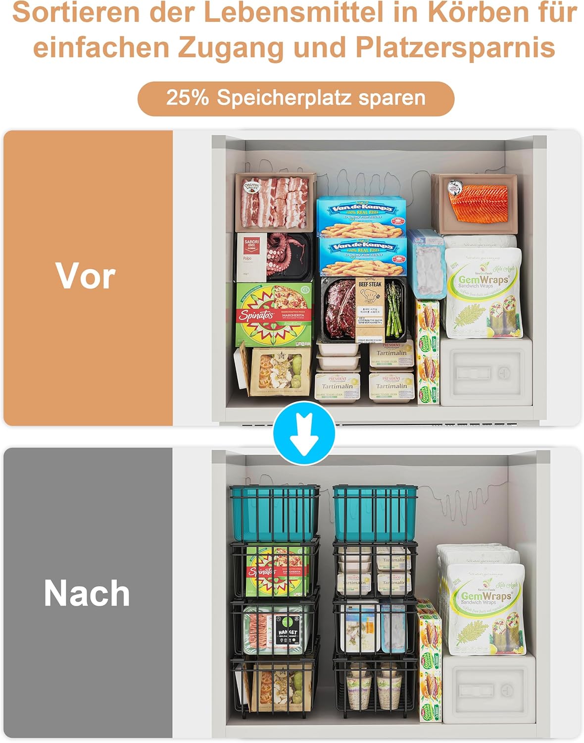 Skladljive za več prostora: košare se lahko poljubno zlagajo ena na drugo in tako učinkovito izkoristijo višino zamrzovalnika.