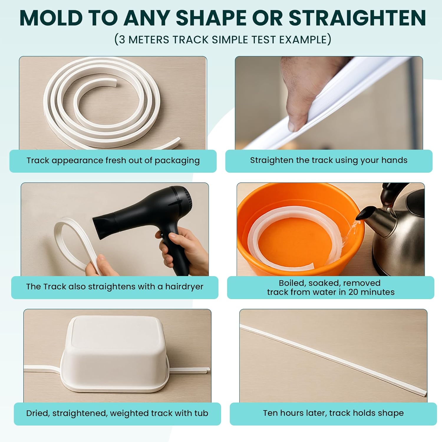 Fleksibilna, a trpežna zasnova: PVC tirnica se upogiba do 180° in se prilagodi različnim oblikam oken ali prostorov brez pokanja.