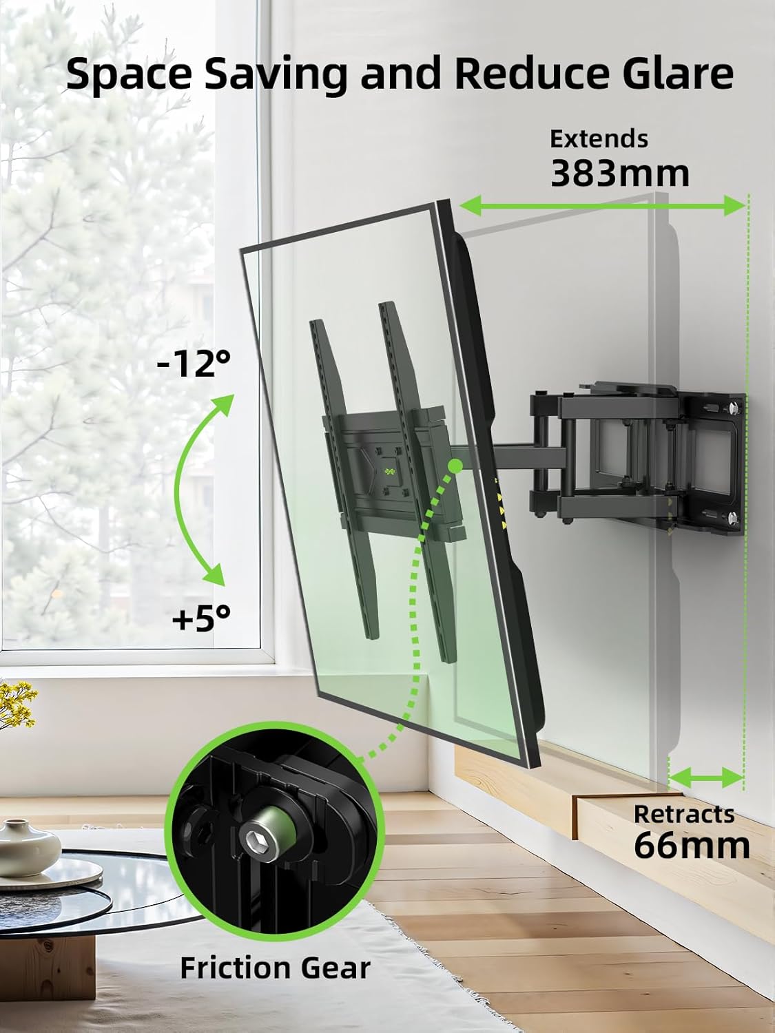 Prihranek prostora: TV lahko popolnoma približate steni ali ga raztegnete za prilagodljivo uporabo – idealno za manjše prostore.