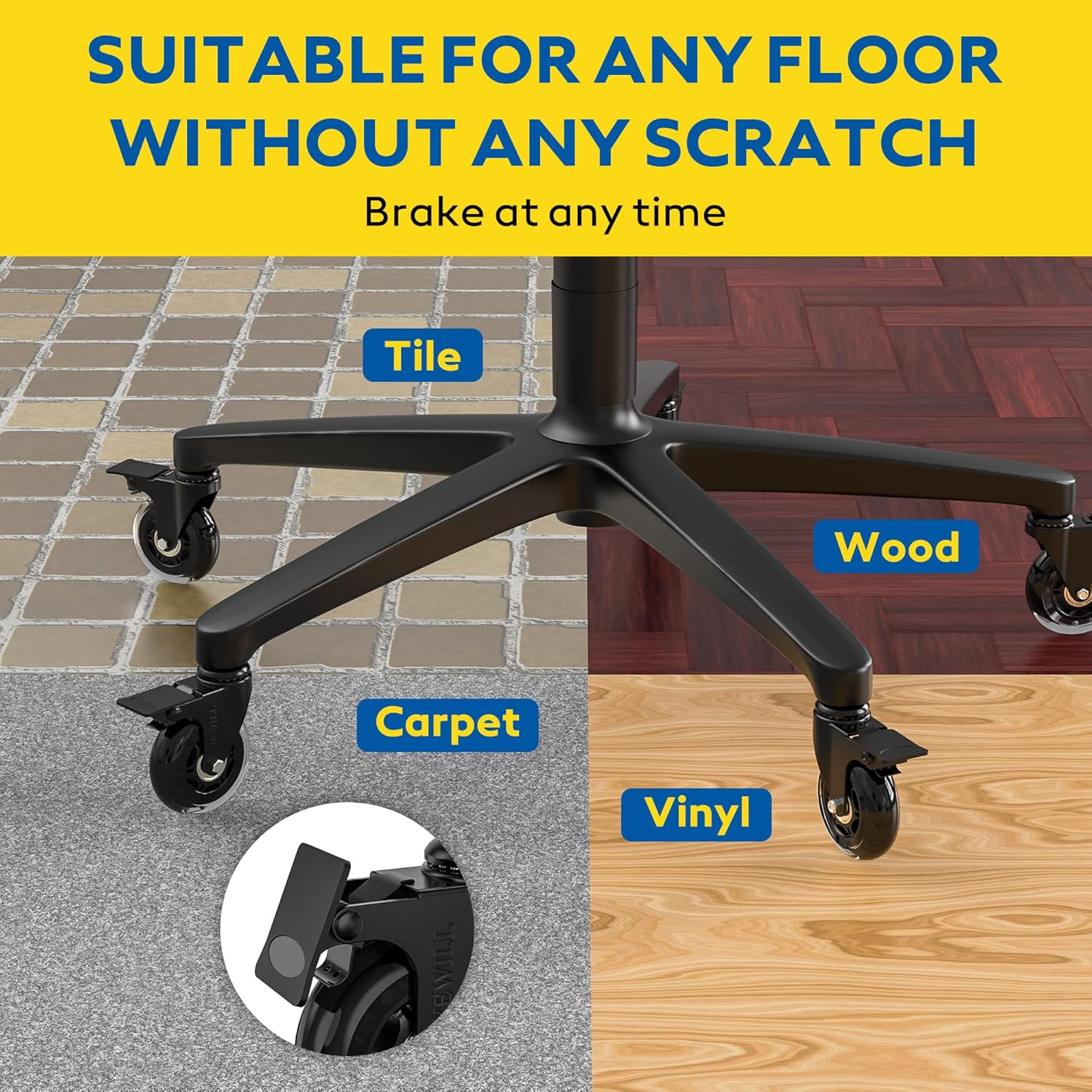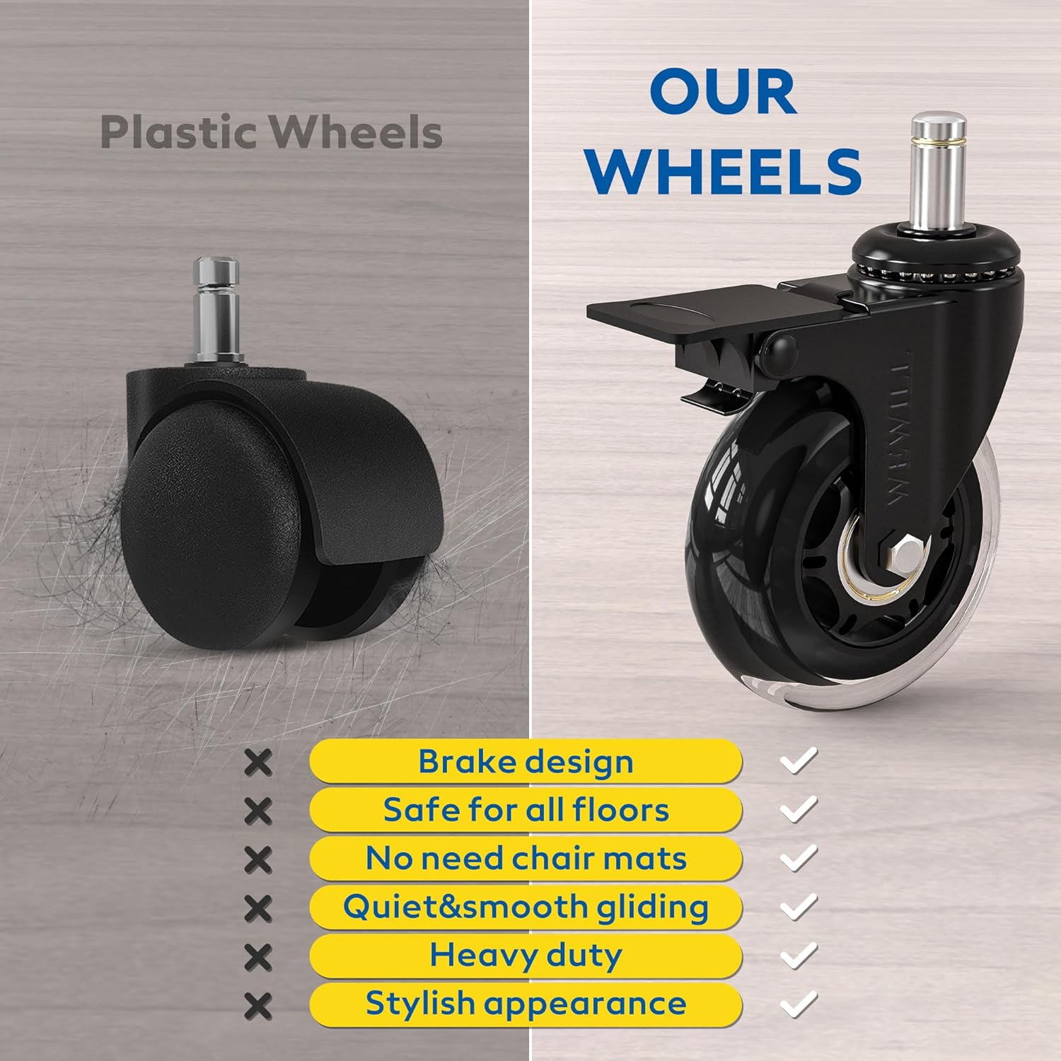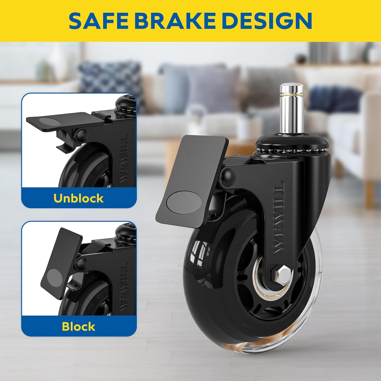 Ta komplet koles WEWILL s funkcijo zavore združuje varnost, tiho gibanje in zaščito tal, zato je odlična izbira za posodobitev pisarniških ali domačih stolov.