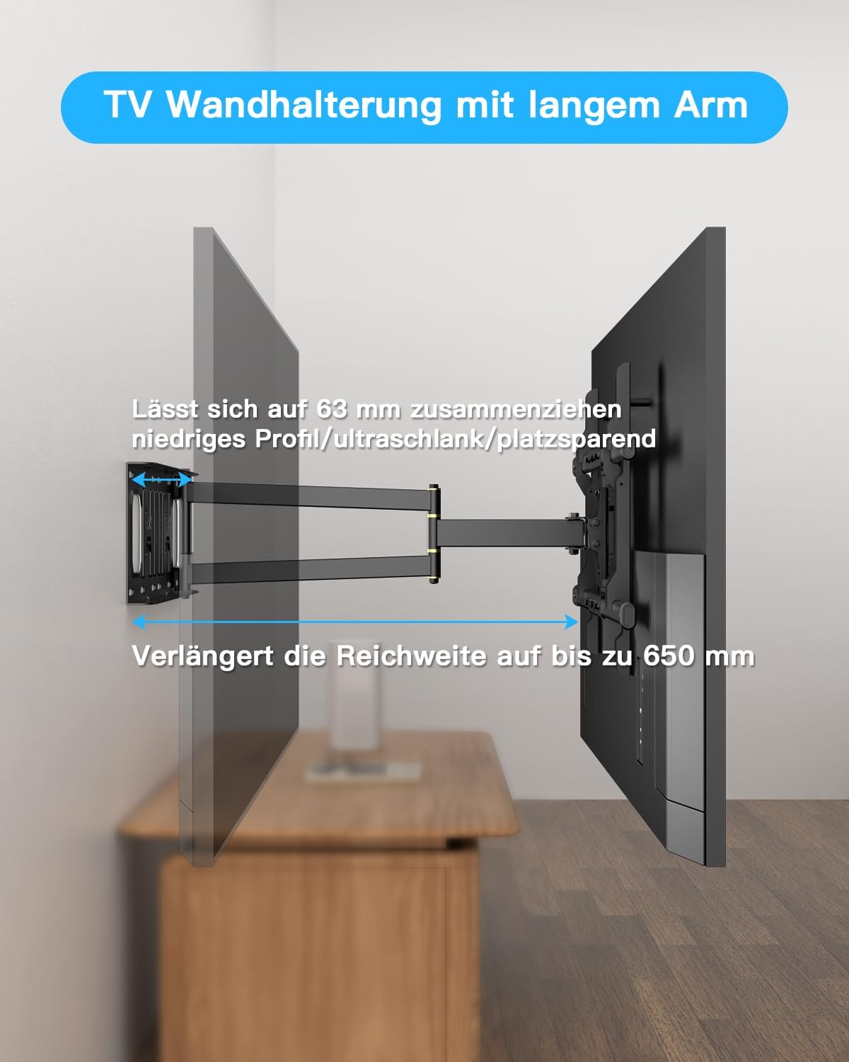 Kakovosten in robusten stenski nosilec z dolgim gibljivim krakom, zasnovan za optimalno gledanje in maksimalno izrabo prostora, primeren za ravne in ukrivljene TV zaslone velikosti od 32 do 70 palcev.