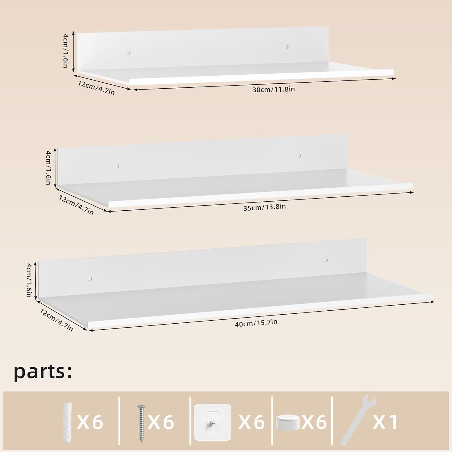 Minimalističen komplet kovinskih polic, primeren za dekoracijo in organizacijo prostora v različnih sobah, enostaven za montažo brez vrtanja ali s standardno montažo.