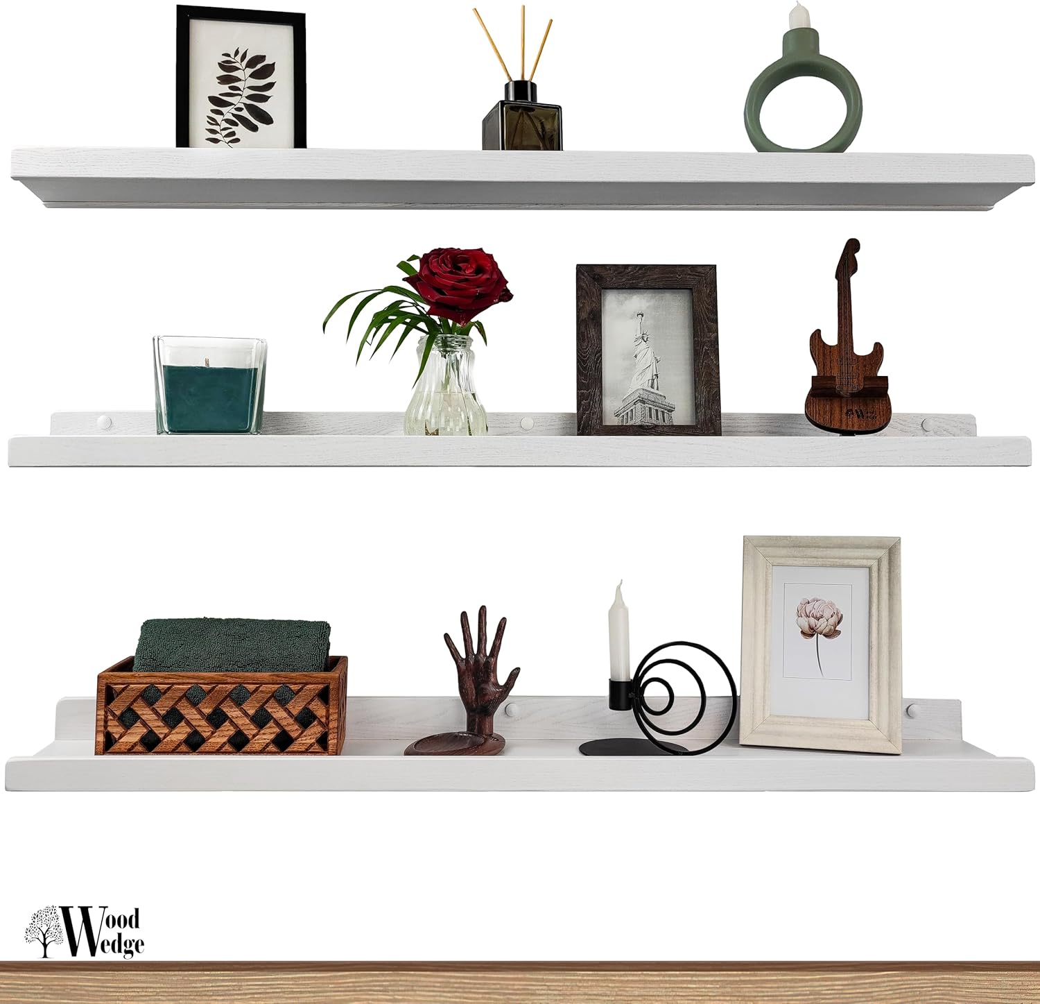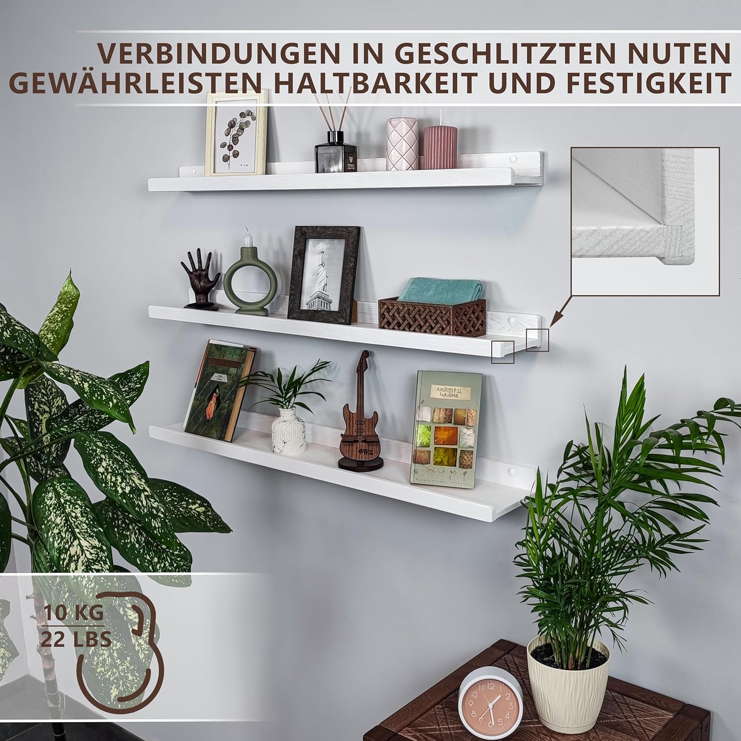 Visoka nosilnost: komplet drži do 20 kg, kar omogoča varno odlaganje slik, dekoracije, dišav, knjig ali kuhinjskih pripomočkov.