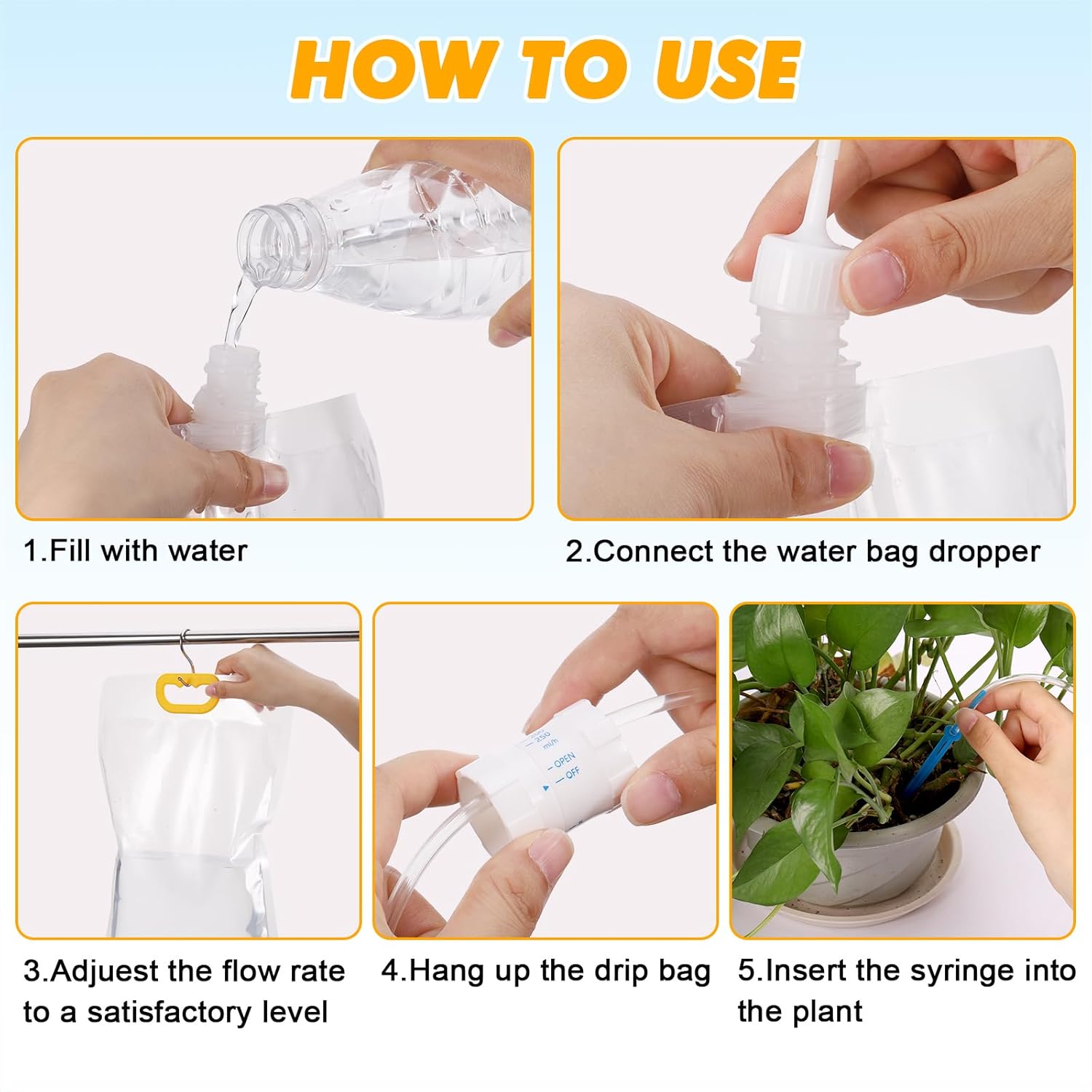 Enostavna uporaba: za delovanje zadošča, da vrečko napolnite z vodo, povežete cev, nastavite hitrost kapljanja in jo obesite nad rastlino.