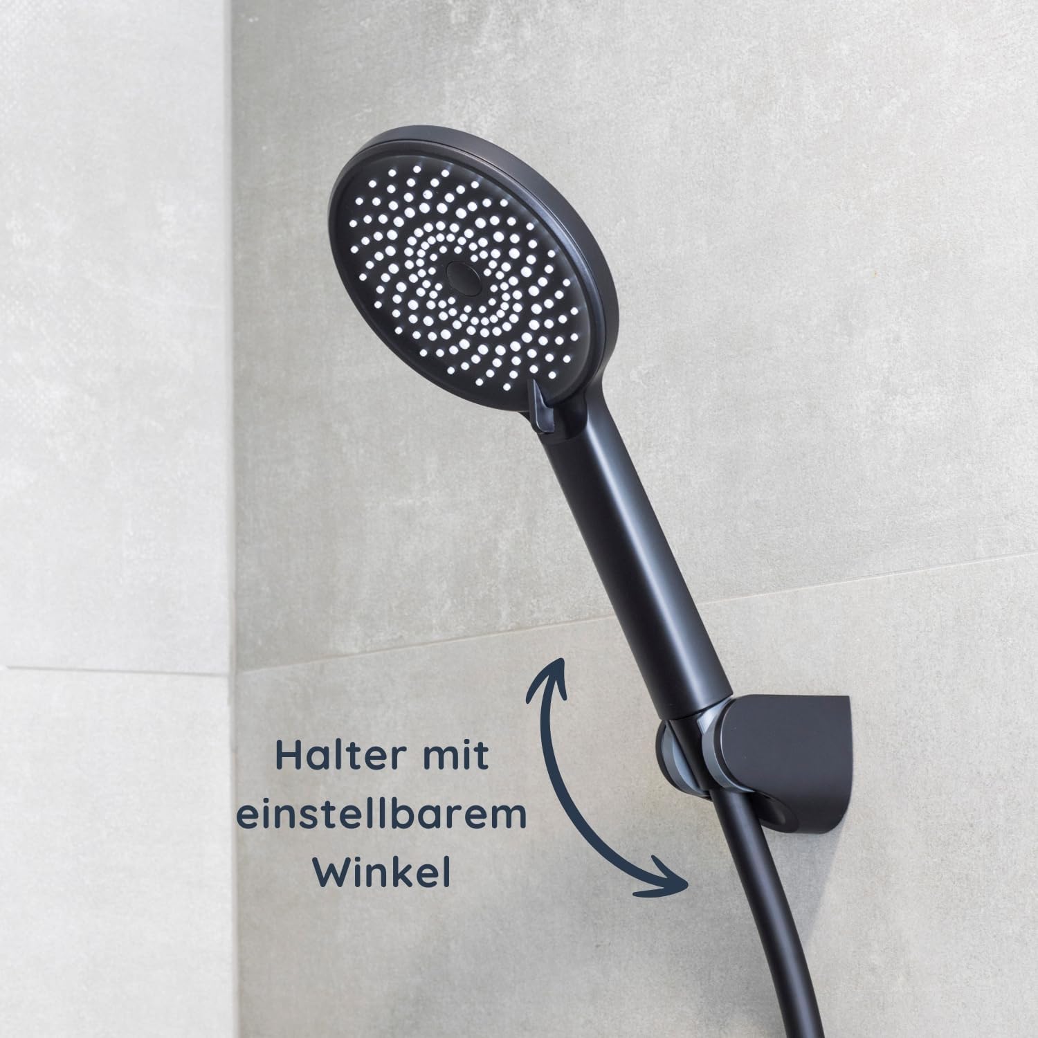Tuš set združuje moderno obliko, funkcionalnost in vzdržljivost. Vključuje veliko tuš ročko s tremi različnimi načini pršenja, 1,5-metrsko cev ter nastavljivo stensko držalo. Zahvaljujoč samoočiščevalnim silikonskim šobam in mat črnemu zaključku je čiščenje enostavno, uporaba pa udobna in prijetna.