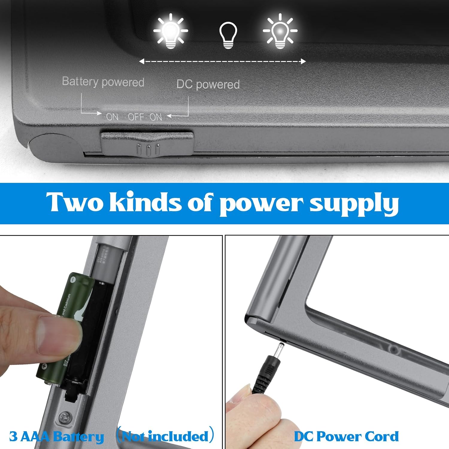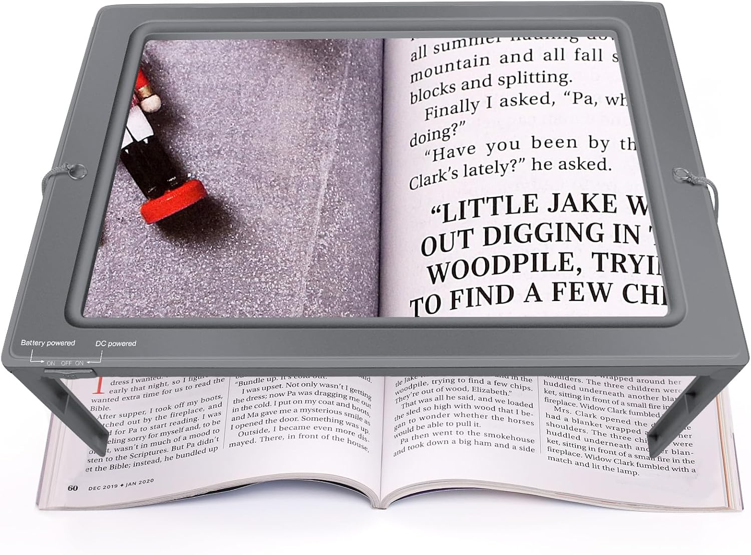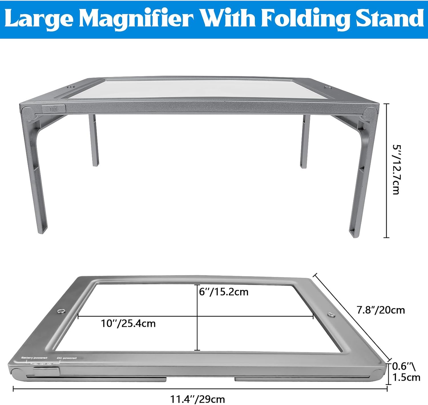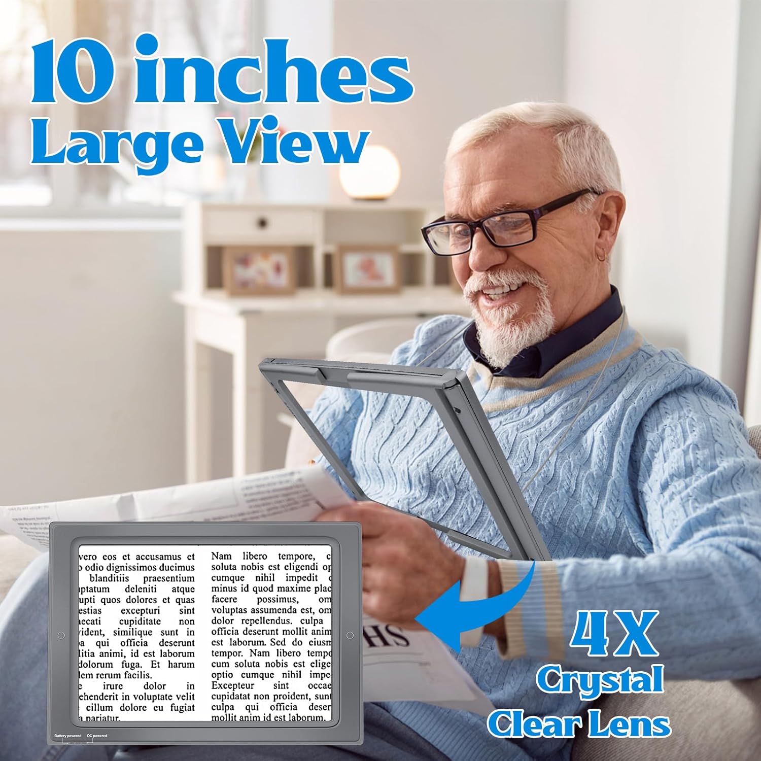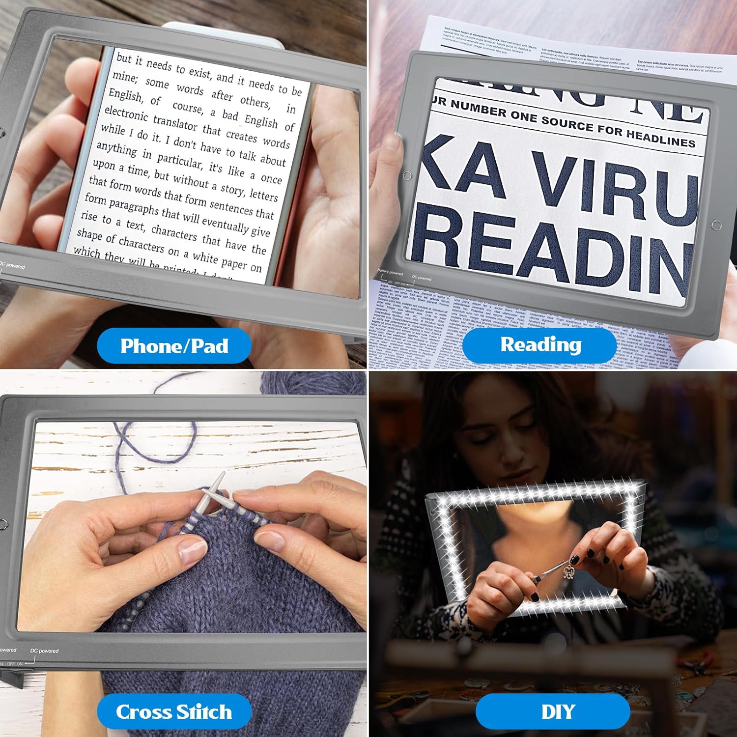Velika pravokotna lupa z akrilno lečo omogoča do 4-kratno povečavo celotne strani ter je opremljena s 50 LED lučkami za udobno branje tudi v slabših svetlobnih pogojih. Primerna je za knjige, časopise, dokumente in drugo drobno besedilo, uporaba pa je možna prostoročno ali ročno.