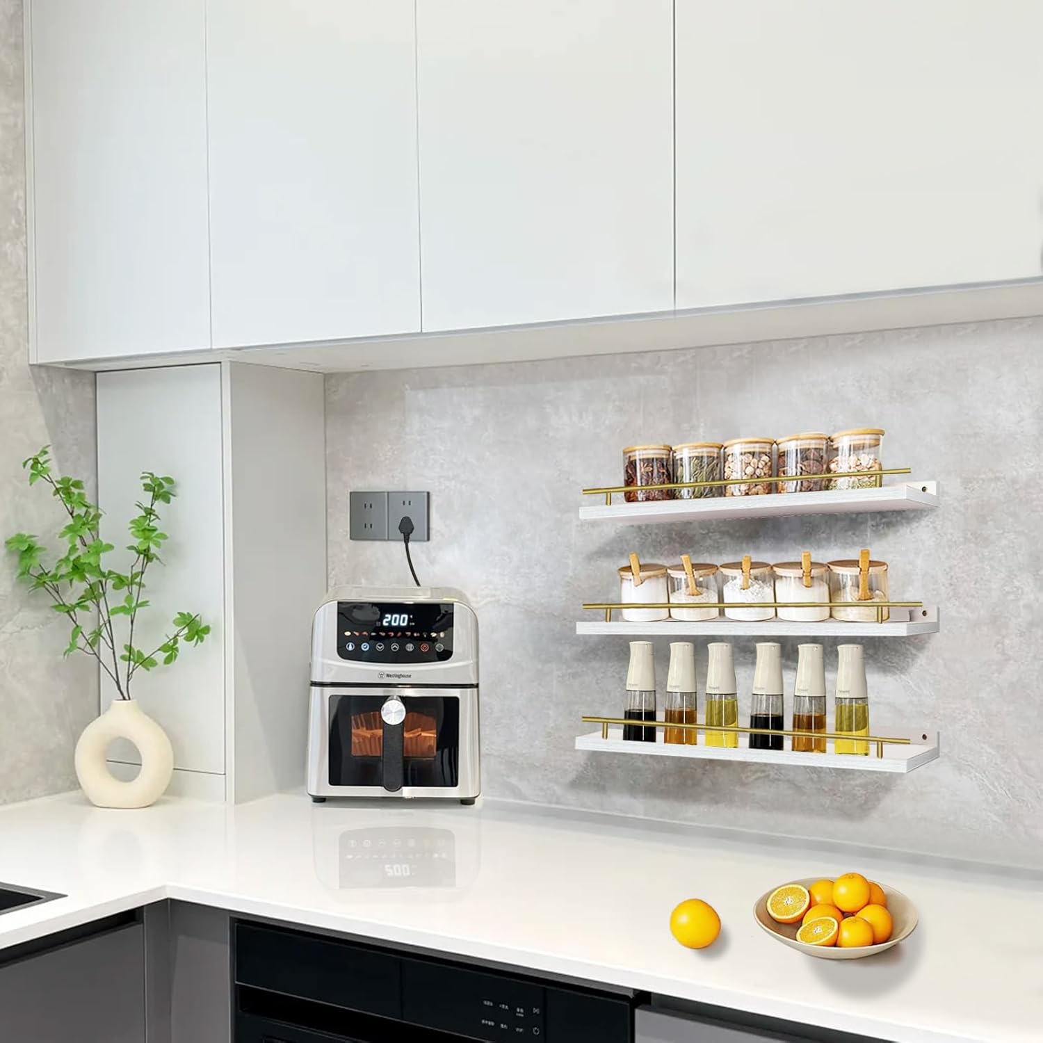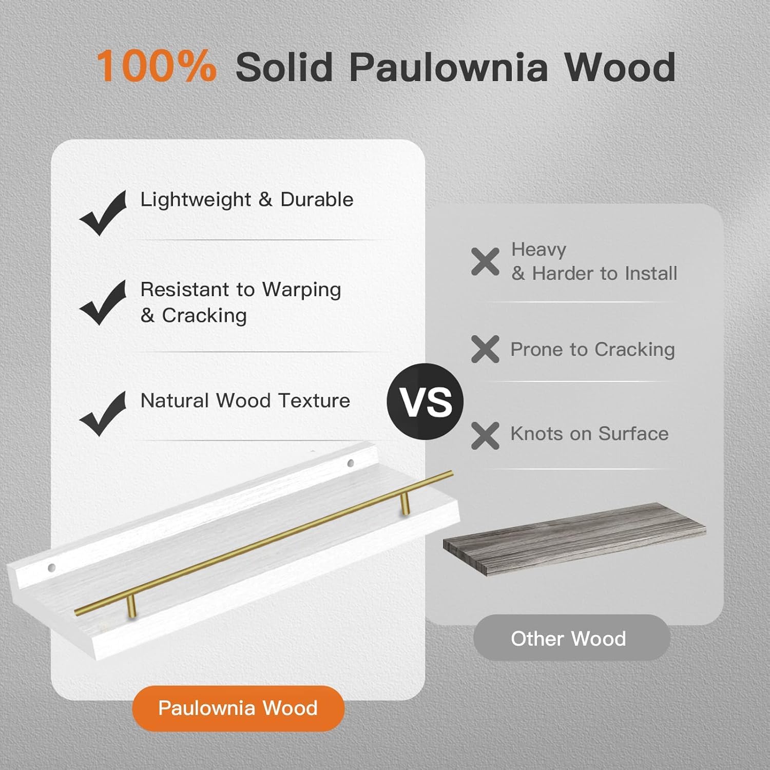 Komplet treh stenskih polic ZVZM združuje funkcionalnost in eleganten videz. Izdelane so iz lahkega, a trpežnega lesa paulownia z naravno teksturo, ki je odporen na vlago, pokanje in obrabo. Vsaka polica je opremljena z metalno ograjo, ki preprečuje padanje predmetov, ter je primerna za kopalnico, kuhinjo, dnevno sobo, spalnico ali pisarno.